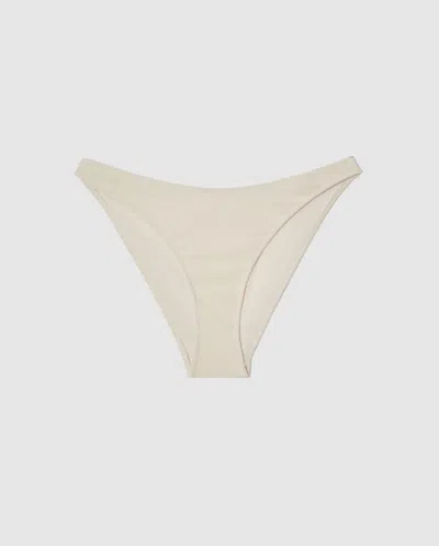Mid rise. Scooped waist. Sunbathing approved. * Textured swimwear fabric with a terry finish * Made using ECONYL®: a regenerated polyamide yarn made of discarded fishing nets and other waste materials * Mid-rise bikini briefs with a flattering, scooped waistline * High cut leg and cheeky coverage * Barely there, hidden elastic waistband * Metal coin with Understatement symbol at back * Soft silicon care label = no itchy tags