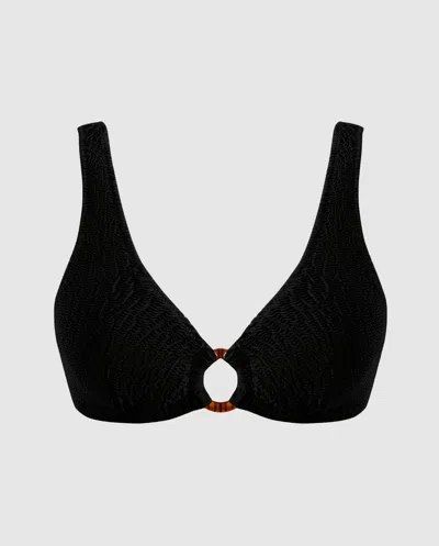 Effortless style with a touch of tortoise charm. * Textured swimwear fabric with a stylish crinkle effect * Made from recycled polyamide * Bikini top with a scooped neckline and adjustable back closure * Wide, non-adjustable shoulder straps for comfortable support * Imitation tortoise ring detail at the center front * Soft silicon care label = no itchy tags
