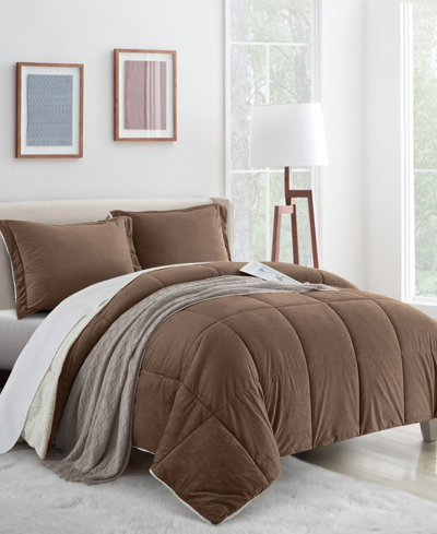 Classic 3 Piece Mediumweight Quilt Sherpa Ultra-soft Reversible Down Alternative Comforter Set, Quee In Brown