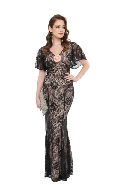 This 1930s style gown is crafted in a lace fabric over a contrasting lining. Complete with back zipper, flutter sleeves, and removable silk flower at the neckline. Lined Back Zipper Removable Pin Flower Material Has No Stretch