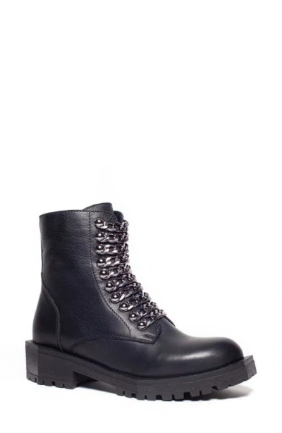 A chunky lugged sole and curb-chain hardware mimicking laces highlight the bold biker edge of this richly grained leather combat boot. 1 1/2" heel; 3/4" platform; 1/2" slope Side zip closure Cushioned insole Leather upper and lining/rubber sole Imported