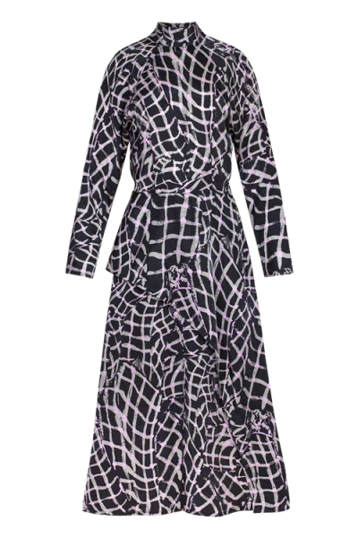 The Replete Dress is a refined midi crafted from silky TENCEL™ Luxe. It’s designed with a high neckline, long dolman sleeves, a softly flared skirt, and a back tie with keyhole opening — a graceful, versatile silhouette for every occasion. Fits true to size Aviwe is 5'9" and wears size Small Zipper at side seam High neckline Long dolman sleeves Back tie with keyhole opening Custom abstract print Folds Eco Dry Clean recommended or hand wash cold with like colors 55% TENCEL™ Lyocell / 45% TENCEL™ Luxe Vegan Biodegradable