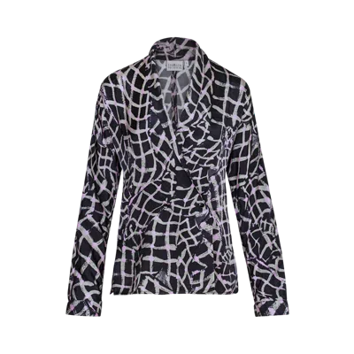 The Pelusa top is a fluid long-sleeve crafted from silky TENCEL™ Luxe. Designed with shawl collar and an assymetic front closure, the Pelusa top has gentle draping through the chest. This effortless and versatile silhouette can be worn on its own buttoned up or layered as a soft blazer. Fits true to size Aviwe is 5'9" and wears size Small Two buttons at front Shawl collar Long dolman sleeves Gentle draping at waist Custom abstract print Folds Eco Dry Clean recommended or hand wash cold with like colors 55% TENCEL™ Lyocell / 45% TENCEL™ Luxe Vegan Biodegradable