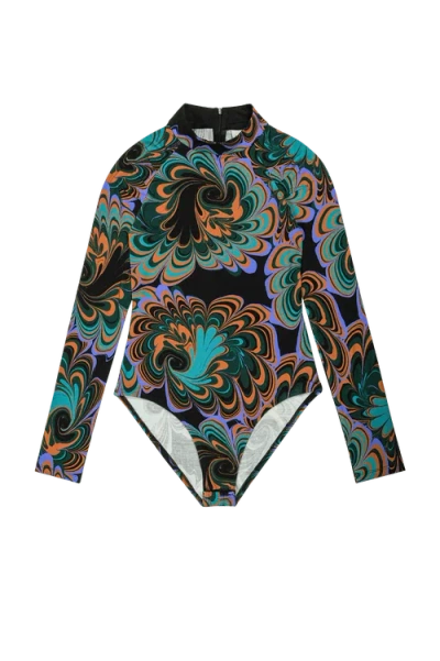 The Serafina bodysuit is fitted with a mock neck and raglan cut sleeves. Cotton twill double snack closure at bottom and hidden zip closure in back. The fabric is medium weight and made from a special cotton/elastane jersey blend. Fits true to size Marija is 5’9” and wears size Small. Machine wash cold with like colors or green dry-clean Vegan Biodegradable