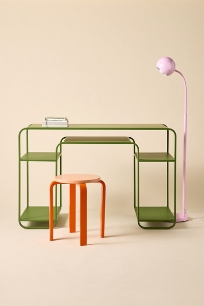 Create a contemporary workspace with our iron-crafted Alana desk. Complete with powder-coated finishes that lend a vibrant pop of color to your space, this desk features allover curving edges with open, airy shelving to display your books, stationery and other office essentials. Available exclusively at Urban Outfitters. Features Alana Desk from UO Home's Alana furniture collection Powder-coated iron construction in colorful finishes Five fixed shelves to store & display your trinkets, novels & essentials Removable legs to easily move throughout your space Versatile - use it as a desk or as a statement storage console Assembly required UO exclusive Content + Care Assembly required - assembly instructions and hardware are included. Iron Wipe clean Imported Size Dimensions: 46" l x 20" w x 30" h Leg height: 2.2" , removable Weight limit: Top: 88.2 lbs; Middle Shelf: 15.4 lbs; Third Shelves: 22 lbs; Bottom Shelves: 33.1 lbs Weight: 42.7 lbs Shipping package dimensions: 33" l x 5.9" w x 49" h Shipping package weight: 49.3 lbs Alana Metal Desk in Green at Urban Outfitters