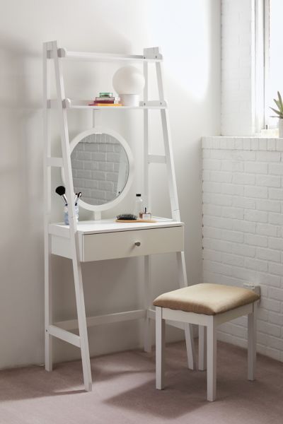 Add a modern update to your getting-ready space and entryways with this vanity set featuring a leaning ladder frame with a round mirror suspending from the shelves. Features a duo of shelves to display your treasured trinkets and leafy buds. Equipped with a spacious drawer to store your getting-ready essentials and complete with an upholstered stool with a cushioned seat. Features Modern vanity and stool set 2 Open shelves 1 Drawer Round mirror in a suspended silhouette Cushioned seat Assembly required Content + Care Assembly required - we recommend two people for assembly. Instructions and hardware are included. 80% Rubberwood, 18% MDF, 1.5% mirror, 0.5% hardware Wipe clean Imported Size Dimensions: 26" l x 18.25" w x 68.5" h Weight: 50.72 lbs Shipping package dimensions: 37.4" l x 21.3" w x 13.4" h Shipping package weight: 61.74 lbs Gail Vanity Set in White at Urban Outfitters