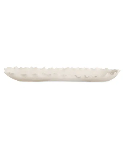 A striking elongated bowl with delicately ruffled edges, reminiscent of ocean waves or mountain ridges. Its fluid form and elegant matte white make it a captivation centerpiece, blending beauty with modern sophistication.