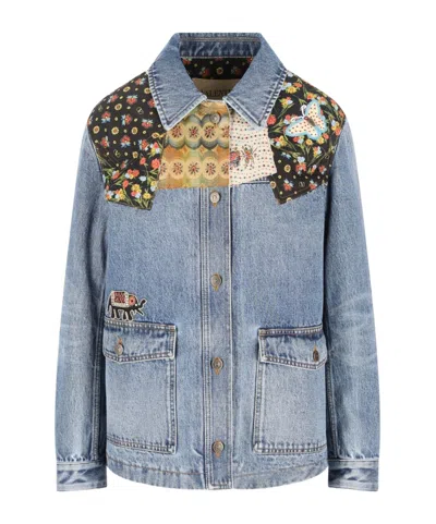 VALENTINO Denim Jacket Padded Collared Neck Patchwork In Blue