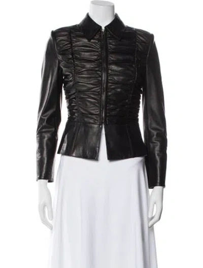 Valentino Leather Down Jacket Black Ruffle Embellishment & Pointed Collar Zip Closure Designer Fit: Designed for a slim fit, those with a curvy figure may wish to take one size up. | Valentino Leather Down Jacket in Black, Women's M