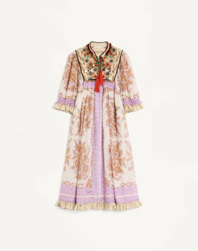 Georgette Lurex dress with Voyage Imaginaire print and embroidered plastron - Tassel detail - Georgette Lurex (90% Cotton, 10% Metallic Fibre) - Georgette Stretch Viscose Lining (91% Viscose, 9% Elastane) - Length: 100 cm / 39.4 in. from the shoulders in an Italian size 40 - The model is 176 cm / 5'9" tall and wears an Italian size 40 - Made in Italy The look of the model is completed by a Valentino Garavani Nellcote Bag and Valentino Garavani Hi Dolly Shoes.