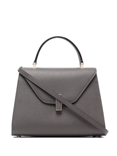 Dark grey calf leather medium Iside tote bag from VALEXTRA featuring grained texture, single rounded top handle, foldover top, twist-lock closure, main compartment, internal slip pocket, adjustable shoulder strap and metal feet.