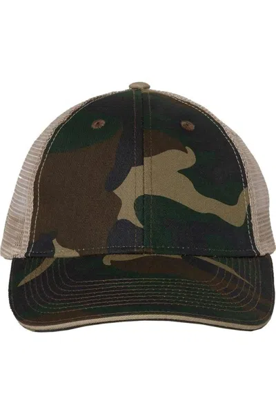 55/45 cotton/polyester twill. 100% polyester mesh back. Structured, six-panel, mid-profile. Pre-curved sandwich visor. Hook-and-loop closure. Tear away label.