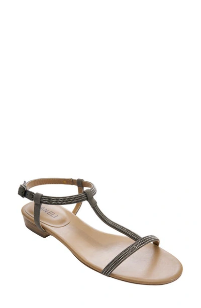 Polished chains illuminate the T-strap styling of this effortlessly chic and minimalist sandal. 3/4" heel Adjustable ankle strap with buckle closure; hidden elastic inset Cushioned footbed Leather upper and lining/rubber sole Imported