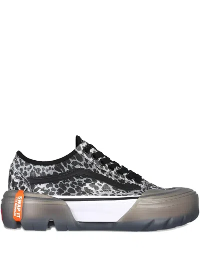 techno fabric, detachable application, brand logo, leopard-print, fabric inner, laces, round toeline, flat, flatform, vans old skool, flatform model , Color: Black , Size: 9