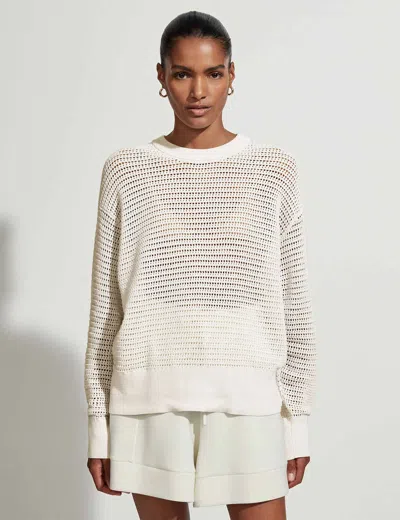 Stay warm and stylish in this versatile and effortlessly cool knitwear staple. Wear it alone or layered, it's the perfect sweater for the season and you'll wish you had it in every color.Ideal choice for those warmer days. Lightweight yet chic layer. Trendy crew neckline. Skillfully crafted from 100% cotton. Featuring an airy open knit that offers both breathability and style. Relaxed fit ensures comfort. Ribbed hem and cuffs. Effortlessly complements both casual and athletic ensembles. Elegant Egret hue. Designed to elevate your transitional looks. Stylish and comfortable all day long. Hand wash. Lay flat to dry.
