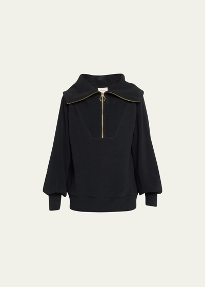 Varley "Vine" solid sweatshirt in signature ribbed cotton-blend. Approx. length: 25" from shoulder to hem. Stand collar; half zip-front. Long bell sleeves. Slightly oversized silhouette. Banded cuffs and hem. Cotton/polyester/spandex. Machine wash. Imported.