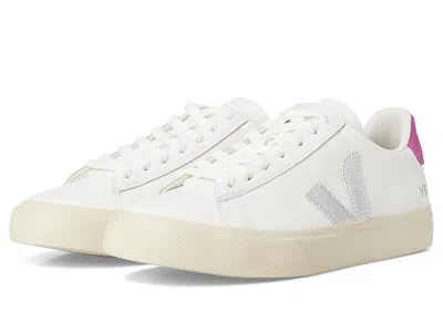 VEJA Campo - Women's Shoes : White Silver Ultraviolet : VEJA takes sustainability seriously. Click to read more about VEJA being a proud Certified B Corporation brand, as well as Leather Working Group Certified. ; The VEJA Campo sneaker will highlight your sporty-chic style with a genuine leather upper, leather and coated canvas overlay panels, and a low-profile silhouette. ; Lace-up design offers a secure fit. ; Round-toe silhouette. ; Padded collar and heel. ; Colorful logo accents at the tongue, side, and heel. ; Lining made of a jersey-blend fabric. ; Cushioned rubber and synthetic insole for added comfort. ; Sole made of wild rubber originating from the Amazonian forest. ; Made in Brazil. Measurements: ; Weight: 13 oz ; Product measurements were taken using size EU 39 (US Women's 8), width M. Please note that measurements may vary by size. | VEJA Campo Women's Shoes White Silver Ultraviolet : EU 36 (US Women's 5) M, Leather