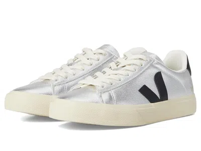 VEJA Campo - Women's Shoes : Silver/Black : VEJA takes sustainability seriously. Click to read more about VEJA being a proud Certified B Corporation brand, as well as Leather Working Group Certified. ; The VEJA Campo sneaker will highlight your sporty-chic style with a genuine leather upper, leather and coated canvas overlay panels, and a low-profile silhouette. ; Lace-up design offers a secure fit. ; Round-toe silhouette. ; Padded collar and heel. ; Colorful logo accents at the tongue, side, and heel. ; Lining made of a jersey-blend fabric. ; Cushioned rubber and synthetic insole for added comfort. ; Sole made of wild rubber originating from the Amazonian forest. ; Made in Brazil. Measurements: ; Weight: 13 oz ; Product measurements were taken using size EU 39 (US Women's 8), width M. Please note that measurements may vary by size. | VEJA Campo Women's Shoes Silver/Black : EU 36 (US Women's 5) M, Leather