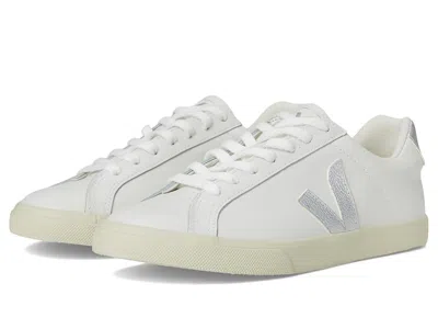 VEJA Esplar Logo - Women's Shoes : Extra White Silver : VEJA takes sustainability seriously. Click to read more about VEJA being a proud Certified B Corporation brand, as well as Leather Working Group Certified. ; The VEJA Esplar Logo sneaker will take your sporty look to the next level with a genuine leather upper, a padded collar, round toe, and low-profile silhouette. ; Lace-up design offers a secure fit. ; Signature logo accents at the tongue, side, and heel. ; Lining made of organic cotton. ; Lightly cushioned insole provides all-day comfort. ; Sole made of wild rubber originating from the Amazonian forest. ; Made in Brazil. | VEJA Esplar Logo Women's Shoes Extra White Silver : EU 40 (US Women's 9) M, Leather