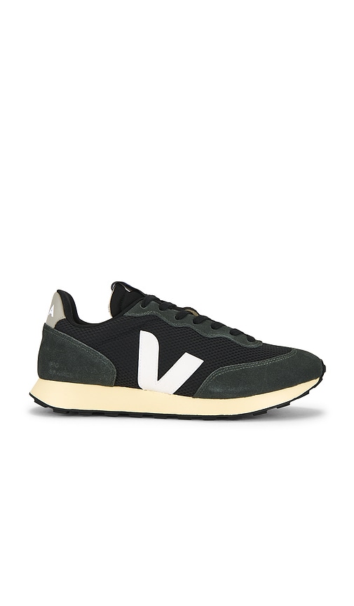 Veja Rio Branco II Sneaker in Black & Pierre - Black. Size 46 (also in 40, 41, 42, 43, 44, 45). Suede and knit mesh upper with rubber sole. Lace-up front. Leather V-logo at sides. Logo detail at back counter. Round toe. Cushioned collar and tongue. VFJA-MZ126. RO1803870. About the designer: Parisian based and Brazilian produced, sustainable sneaker brand Veja creates organic, innovative collections sourced from South America. 'Veja' translated from Portuguese-Brazilian dialect meaning 'look', aims for wearers to 'look beyond sneakers, look how they are made'. Their iconic silhouettes are naturally sourced from 100% organic cotton canvas and Brazil-sourced leather, along with fairly traded rubber soles. The resulting designs allow wearers to go about their day comfortably, all while leaving a positive impact on the environment. By linking together economic justice and social initiatives, and utilizing products that impact the environment positively, Veja has proven that sustainable styles can also be deemed fashionable.