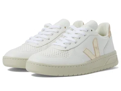 VEJA V-10 - Women's Shoes : Extra White/Platine 1 : The primary materials that compose this product contain a minimum of 20 percent organic content. ; ; VEJA takes sustainability seriously. Click to read more about VEJA being a proud Certified B Corporation brand, as well as Leather Working Group Certified. ; The primary materials that compose this product contain a minimum of 20 percent recycled content. ; Take your look to the next step when you're running around town sporting the VEJA V-10 sneakers. ; Lace-front closure with blind eyelets. ; Round-toe silhouette with perforated accents. ; Logo at the heel. ; Subtle logo stitched at the vamp. ; Upper materials vary by colorway: see breakdown ; Textile lining. ; Insole made out of expanded polyurethane and organic cotton. ; Sole made of wild rubber originating from the Amazonian forest. ; Made in Brazil. ; 100% polyester uppers: B-Mesh White/Natural/Marsala, B-Mesh White/Orange/Fluo, Nautico/Pierre, Suede Multicolor/Natural/Rose/Fluo, White/Brittany, White/California/Natural, White/Gold, White/Gold 2, White/Marsala/Brittany, White/Petale/Orange Fluo ; 70% recycled polyester, 30% recycled cotton: Snow Black Flannel, Snow Black Flannel 1, Snow/Black ; 46% polyurethane, 44% organic cotton, 8% rinicus oil, 2% corn starch: Black/Black/Sole, Full White, White/Brittany 1, White/California 1, White/Orange/Fluo, White/Oxford Grey/Black, White/Petale, White/Petale/Black, White/Petale/Black 2, White/Steel/Nautico ; 46% polyurethane, 44% organic cotton, 10% corn-based materials: White/California, White/Matcha 1, White/Rose Fluo ; 36% cotton, 35% polyurethane, 29% corn-based materials: Full White/Natural, White/Matcha, White/Natural, White/Orange Fluo/Marsala, White/Oxford Grey, White/Ultraviolet/Purple ; 100% bovine leather: Black/Black Sole Black/White/White Sole, Camel/Desert, Extra White, Extra White Oxford/Oxford Grey/Orange Fluo, Extra White/Black, Extra White/Camel, Extra White/Nacre Leather, Extra White/Nautico/Pekin, Extra White/Petale, Extra White/Petale/Dried Petal Suede, Extra White/Petale/Rose Fluo, Extra White/Platine, Extra White/Platine/Silver, Extra White/Purple/Black, Extra White/Venus, Extra-White Lilas Sole Leather, Gold Leather, Leather Extra White/Jaune/Fluo, Leather Extra White/Orange/Fluo/Cobalt, Make My Lemonade Emeraude, Make My Lemonade Guimauve, Make My Lemonade Sable, Mud/White/Gum Sole, Multico Sable/Parme, Multicolor Burgundy Lilas Pixel, Multicolor Lavender, Multicolor Peach, Multicolor/Almond California, Multicolor/Rose/Natural/Gris Suede, Petale/White/Multicolor, Sable/Menthol/Multicolor, Suede Multicolor/Natural/Babe Measurements: ; Heel Height: 2 1 2 in ; Weight: 1 lb ; Product measurements were taken using size 7, width W (C). Please note that measurements may vary by size. | VEJA V-10 Women's Shoes Extra White/Platine 1 : EU 35 (US Women's 4) M, Synthetic