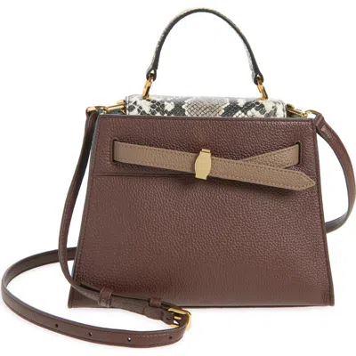 A belt with gleaming hardware cinches the structured profile of this leather tote featuring a single top handle and an optional crossbody strap for hands-free carry. 9 3/4" x 7 1/4" x 3" 18 3/4" shoulder strap drop Magnetic-snap closure Top carry handle; removable, adjustable crossbody strap Interior zip pocket Structured silhouette with flat base for stability Lined Leather Imported