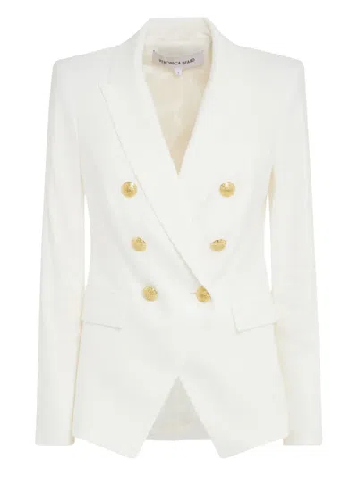 white double-breasted button fastening jetted chest pocket two front flap pockets central rear vent