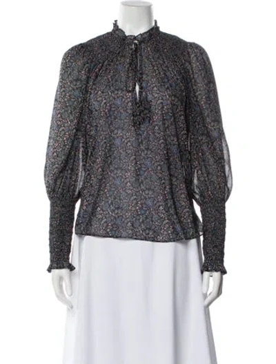 Veronica Beard Blouse Black & Blue Printed Ruffle Embellishment Long Sleeve with Mock Neck Button Closure at Front Designer Fit: Tops by Veronica Beard typically fit true to size. | Veronica Beard Printed Mock Neck Blouse in Black/Blue, Women's US 2 | XS
