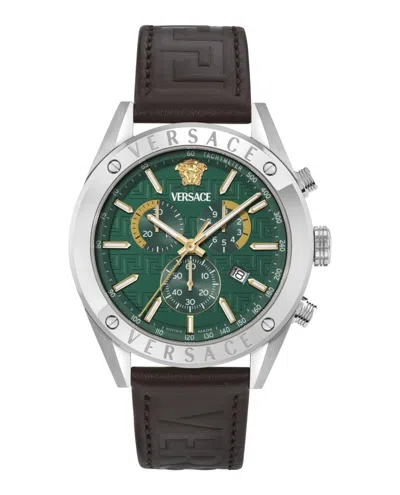 The Athletic Chrono By Versace Exemplifies Luxury And Precision, Featuring A Distinguished Green Guilloche Dial Adorned With Elegant Gold Accents. Enclosed Within A Robust 44Mm Stainless Steel Case, This Timepiece Boasts A Sophisticated Brown Calf Leather Strap Secured By An Ardillon Buckle. With A Water Resistance Of Up To 5 Atm, It Seamlessly Merges Functionality With Refined Style, Making It The Ideal Accessory For The Modern Man.- Green Guilloche Dial - Gold Accents - 44Mm Stainless Steel Case - Brown Calf Leather Strap - Ardillon Buckle - Water Resistance: 5 Atm