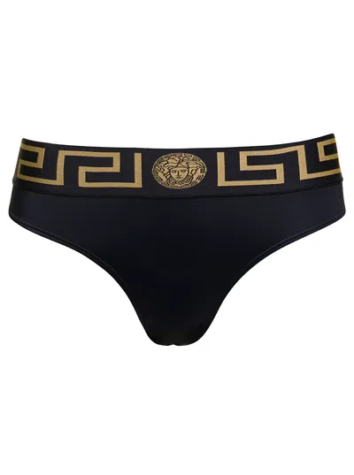 Versace bikini bottom briefs featuring a Greca border and Medusa motif Low-rise hipster style Moderate seat coverage Nylon/elastane Hand wash or dry clean Made in Italy Top sold separately