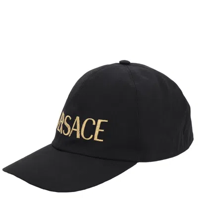 Versace Ladies Apparel Accessories. Fashion category - Hats. SKU - ICAP006-A234764-A4007. Color - Black/Gold. Versace Black Embroidered Logo Baseball Cap. Versace's cotton baseball cap embellished with the brand logo embroidered in gold-tone thread. 100% Cotton. Made in Italy.