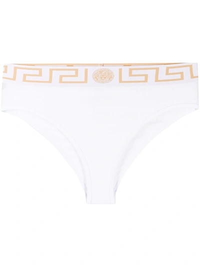 VERSACE Classic Thong in Bianco Ottico - White. Size 4 (also in 1, 2, 3). Self: 94% cotton 6% elastaneTrim: 82% poly 9% elastane 9% nylon. Made in Bosnia. Hand wash. Medusa and Greca motif on the elasticized band. Jersey fabric. Item not sold as a set. VSAC-WI20. AUD01042 A232741. About the designer: Since 1978, Gianni Versaces iconic Italian label has been celebrated for its over-the-top glamour and sexiness. After Gianni's tragic death in 1997, his sister Donatella took the creative reins, and while remaining consistent with Gianni's design aesthetic, Donatella has brought a bold femininity and subtle polish to the beloved design house.
