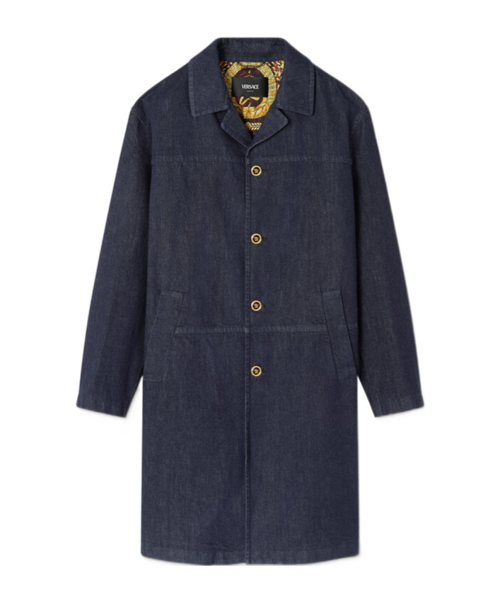 dark blue cotton denim logo-engraved buttons notched lapels button fastening long sleeves mid-length two slip pockets straight hem central rear vent printed lining