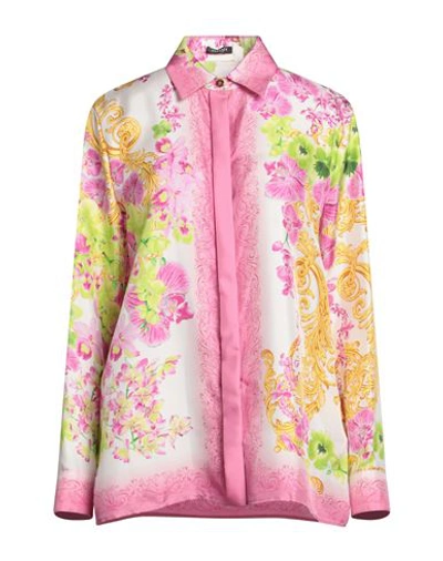 button-down printed silk shirt from Versace featuring white/multicolour, silk, all-over floral print, signature Medusa Head buttons, pointed flat collar, long sleeves, buttoned cuffs and straight hem.