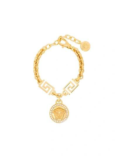Gold-tone brass Medusa-charm rolo-chain bracelet from VERSACE featuring Medusa plaque detail, crystal embellishment, signature Greca detailing, rolo chain, lobster claw fastening and adjustable-length chain. This item is in size UNI and the color is Gold