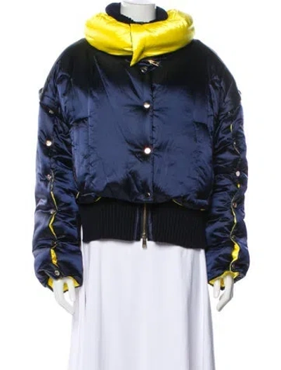 Versace Down Coat Blue Colorblock Pattern Stand Collar Short Zip Pockets & Snap Closure Fit: Coats by Versace typically fit true to size. | Versace Colorblock Pattern Down Coat in Blue, Women's US10, IT46 | L