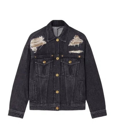 Discover timeless sophistication with the Versace Vintage-Effect Denim Jacket. Crafted from premium denim with a richly textured, substantial weave, this jacket masterfully balances an effortlessly classic trucker silhouette with a subtle oversized fit. The wide collar and perfectly tailored shoulders evoke a sense of elevated nonchalance, while the pronounced distressed pattern featuring artfully frayed sections and lighter-hued abrasions delivers irresistible vintage allure. The piece is distinguished by its metal buttons in an old gold finish, each emblazoned with the designers logo. A leather patch, proudly bearing the embossed VERSACE insignia at the back hem, is an unmistakable mark of prestige and authenticity. Two flapped chest pockets with signature hardware enhance both practicality and statement appeal, forging a garment where refinement meets rebellious spirit. Why choose this product? Impeccable Italian craftsmanship by Versace Distinctive distressed detailing and vintage-inspired design Luxurious all-cotton denim with a robust hand-feel Exclusive branding and authentic finishing touches Classic yet contemporary for versatile styling Composition: 100% Cotton
