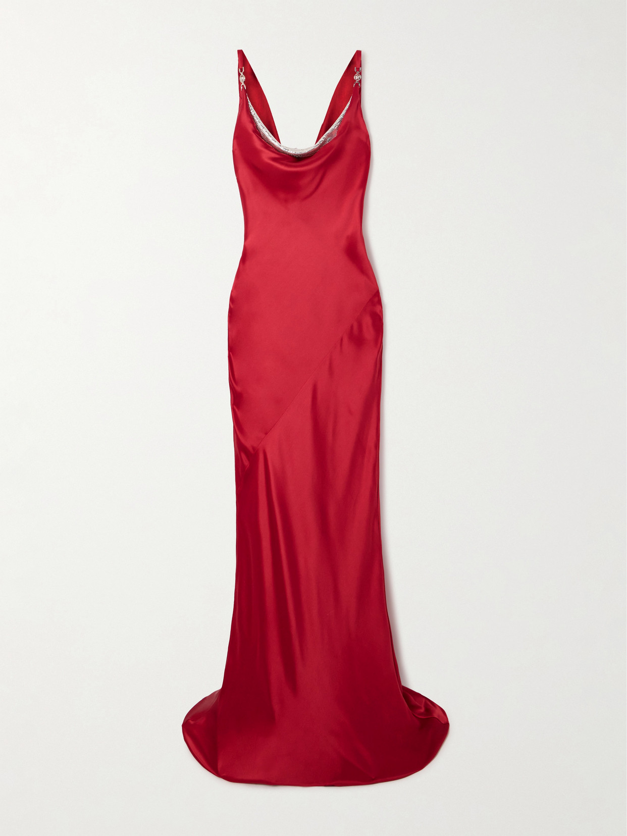 Versace's dress is the kind that leaves an impression. Bias-cut from red silk-satin, it has a draped cowl neckline with a panel of silver sequins peeking out. It falls to a floor-pooling hem (to be tempered with your highest heels, of course) and is decorated with the house's iconic 'Medusa' hardware at the pin-thin straps.