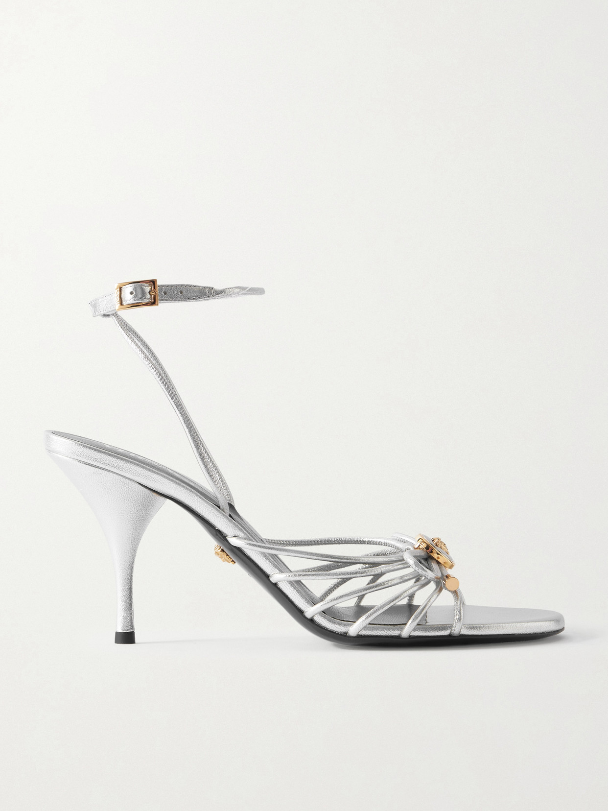 The iconic 'Medusa' embellishment crowning Versace's sandals confirms their glamorous DNA. Defined by an alluring, strappy profile, they've been crafted in Italy from metallic leather and set on fluted stiletto heels. The chic open toes call for a fresh pedicure.- For Women.