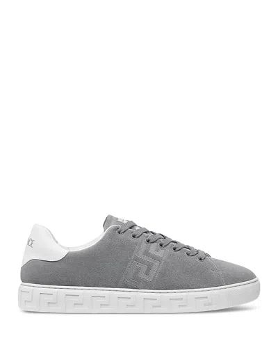 Versace Men's Embroidered La Greca Suede Sneakers.Color:Concrete.Size:9.5US / 42.5EU.Material:Suede upper, polyester lining, rubber sole.