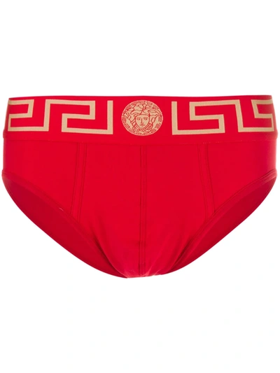 Match your branded clothing to your underwear with these red stretch cotton and gold-tone Medusa Greek Key briefs from Versace. Featuring an elasticated waistband and a Medusa detail. Underwear and lingerie must be tried on over your own garments.