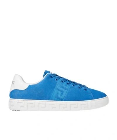 Versace "La Greca" lowtop sneakers in suede featuring tonal Greek Key accents on the midsole and sides Flat heel Round toe Laceup vamp Woven label on the tongue Padded collar Backstay logo Polyester lining Rubber outsole Made in Italy