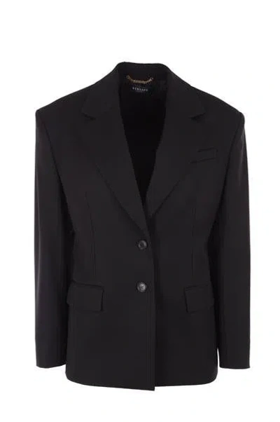 Versace’s oversized single-breasted jacket crafted in black wool gabardine. Featuring notch lapel, button closure, padded shoulders, long sleeves with buttoned cuffs, front pockets and back central vent. The design is completed by the logo label at left cuff. Lined interior.