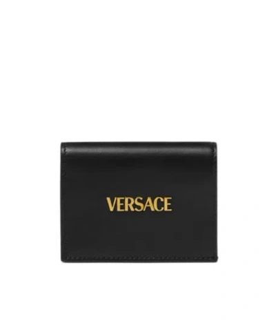 A compact bifold wallet in a smooth calf leather featuring a metal Versace Logo lettering, multiple interior card slots, a zipped coin pouch and a note compartment.