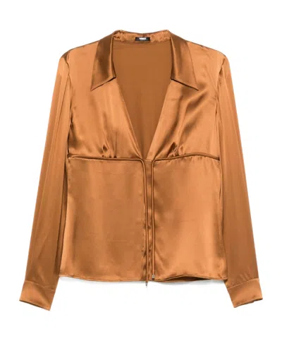 VERSACE Tie Front Blouse in Tobacco - Brown. Size 40 (also in 38). 100% silk. Dry clean only. Front button closure. Wrap around tie closure. V-neck styling. Button cuffs. Lightweight satin fabric. VSAC-WS287. 1019324_1A12105. About the designer: Since 1978, Gianni Versaces iconic Italian label has been celebrated for its over-the-top glamour and sexiness. After Gianni's tragic death in 1997, his sister Donatella took the creative reins, and while remaining consistent with Gianni's design aesthetic, Donatella has brought a bold femininity and subtle polish to the beloved design house.