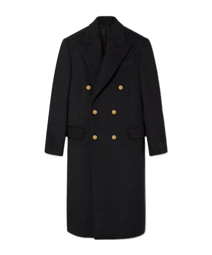 Info & Care Versace wool pea coat Peaked lapels, padded shoulders, designer tag at left cuff, faux button-fastening cuffs, chest slit pocket, front flap pockets, three internal pockets, fully lined Double-breasted button fastenings through front 100% wool; lining: 100% cupro Dry clean Size & Fit Length shoulder to hem: 50 inches/ 127cm Midweight Structured, oversized fit Straight cut Model is 6'1"/ 185cm, chest size 36 inches and wears a size IT48