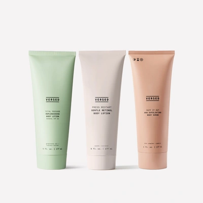 Dermatologist-Tested | Sensitive Skin-Approved | Fragrance-FreeGet smooth, glowing skin from shoulders to toes with our Complete Body Care Collection. Your body care upgrade begins in the shower with a creamy AHA exfoliating body scrub starring lactic and glycolic acids that work with microfine pumice and pomegranate enzymes to banish bumps, target hyperpigmentation, and polish away dry patches. At night, our best-selling retinol body lotion works while you sleep to visibly transform uneven tone while firming crepey skin and softening wrinkles. In the morning, our lightweight, antioxidant-rich daily body lotion replenishes moisture and protects your results with sheer, non-sticky mineral SPF.Total Package Replenishing Body Lotion Mineral SPF 30 | 6 fl. oz.; Press Restart Gentle Retinol Body Lotion | 6 fl. oz.; Buff It Out AHA Exfoliating Body Scrub | 6 fl. oz.;