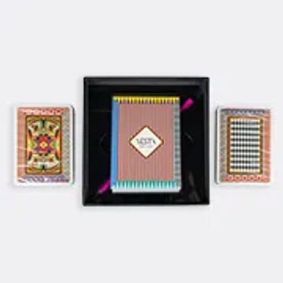 Vesta's lively set of playing cards includes two stylized decks with coordinating stationery. Capturing the energy and aesthetic of traditional play, the contrasting designs feature intricate borders and synchronizing stripes, diamonds and abstract artwork. A vivid pink pencil accompanies the notebook in this thrilling multicolor set by the Italian brand.