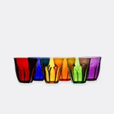 This set of six polished tumbler glasses by Vesta is part of the Italian brand's stylishly simple 'Party' series. Functional pieces for both everyday and entertaining, the multicolor version of this elegant stackable design is cut from a light yet resilient resin. Impressions in the glass ensure a firm and comfortable grip. The 'Ankon' glass set adds rich pigment to tables in shades of purple, orange, red, green, blue and yellow. Glasses can be mixed and matched with synchronizing clear and colorful designs from the collection for a coordinated, chromatic look.