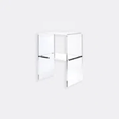 The completely clear 'Vega 2.0' bedside table juxtaposes clean lines and soft, smooth edges. A feature in its own right, the table is molded from acrylic crystal in a simple, poised silhouette and features a single shelf. This transparent design seems to 'disappear' into room set-ups, giving the illusion of more space and creating a clean flow of energy. Lamps or other items placed on the table appear to float. Presented as a duo, or singularly, in a bedroom or elsewhere, this versatile design by Vesta brings a singular dynamism to spaces.